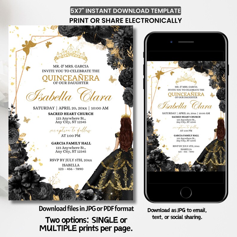 Floral Quinceañera Invitation Template: Black and Gold XV (digital) Etsy