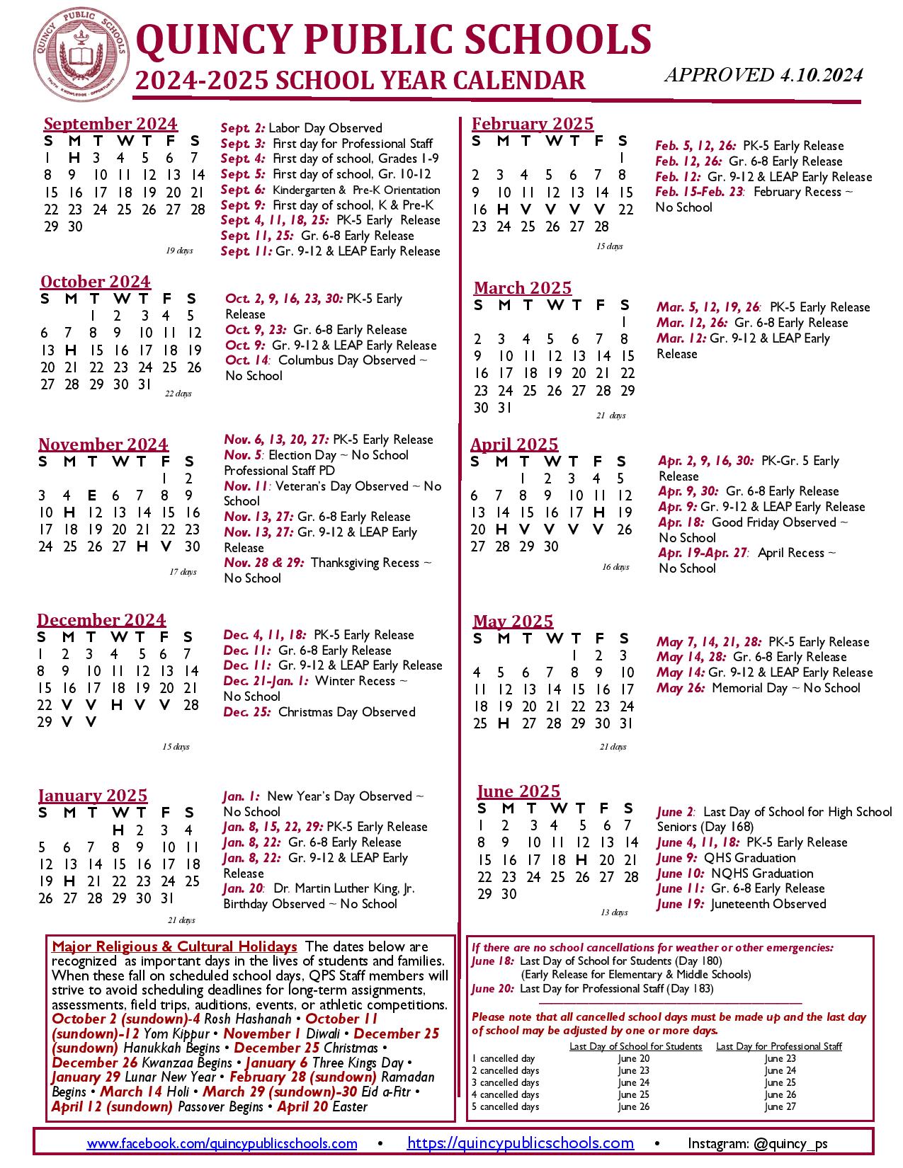 Quincy Public Schools Calendar 2025 2026 Holiday Breaks New School