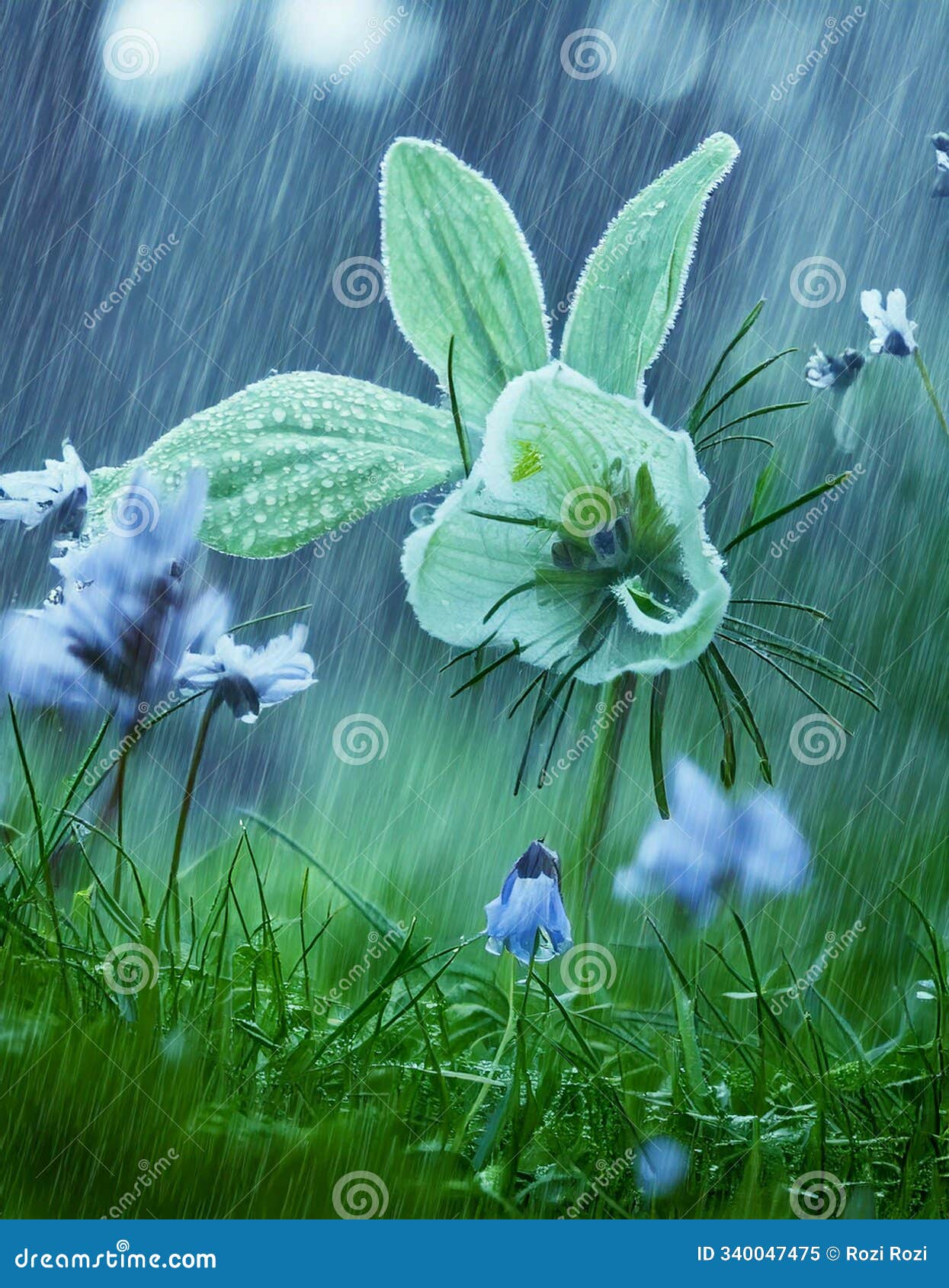 A Flower with a Bunny on it is in the Rain Stock Illustration