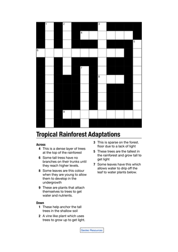 Tropical Rainforest Adaptations Crossword Teaching Resources