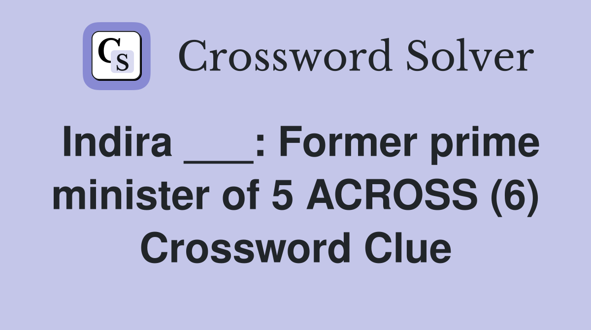 Indira : Former prime minister of 5 ACROSS (6) Crossword Clue
