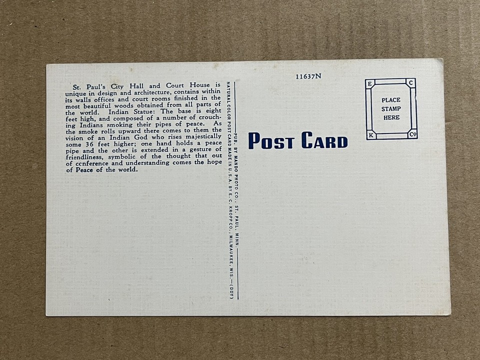 Ramsey County Court House Indian God of Peace St Paul MN Postcard