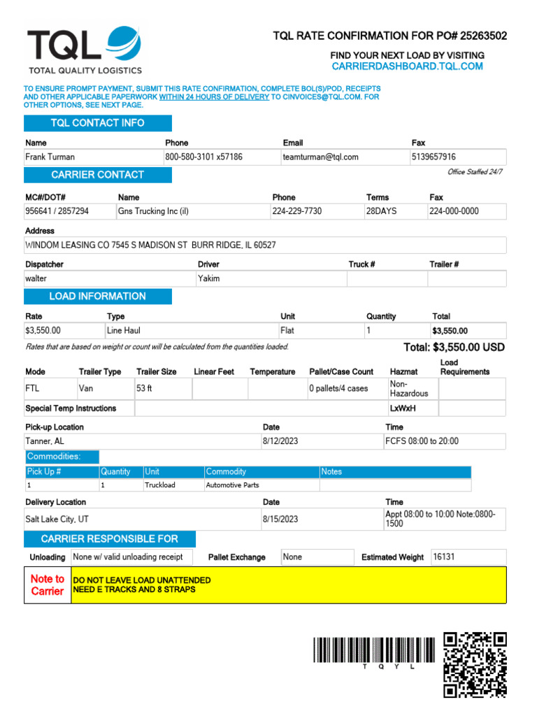 Rate Confirmation IEL PO#: 215477 AAA Dedicated Logistic Fill and