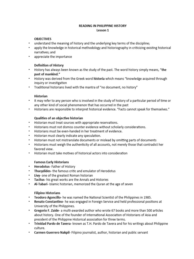 READING IN PHILIPPINE HISTORY Lesson 1 PDF Historian Knowledge
