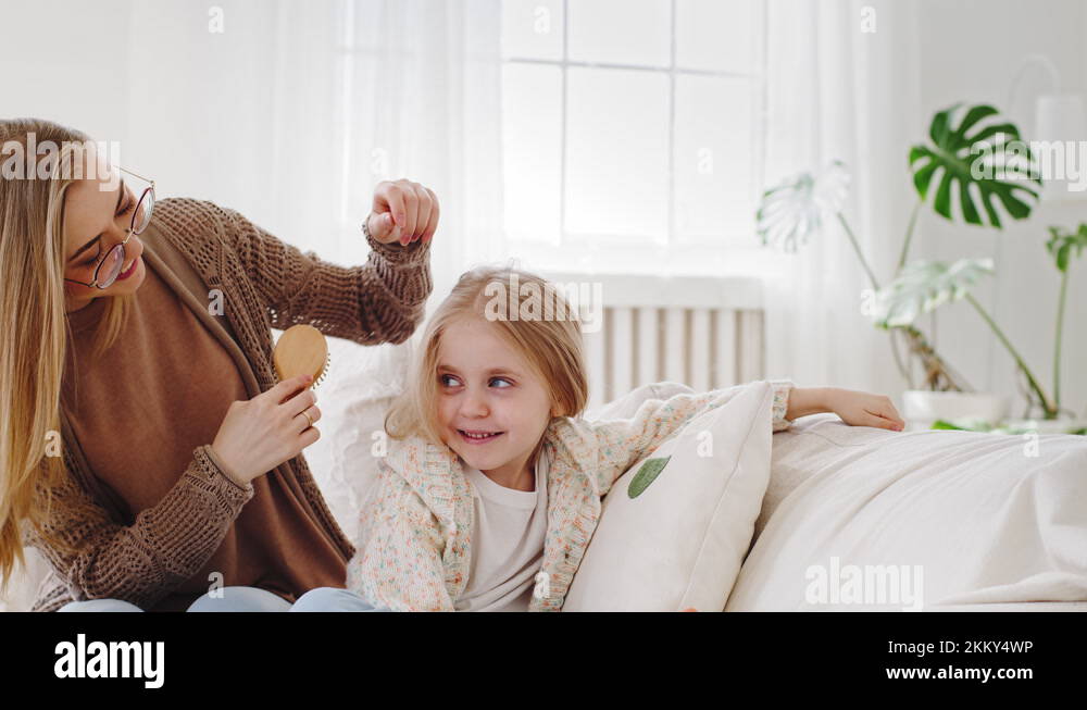 Close up portrait young blonde woman in glasses caring mother loving