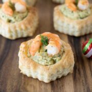 Puff pastry vol au vents with shrimp and dill on a light wooden board