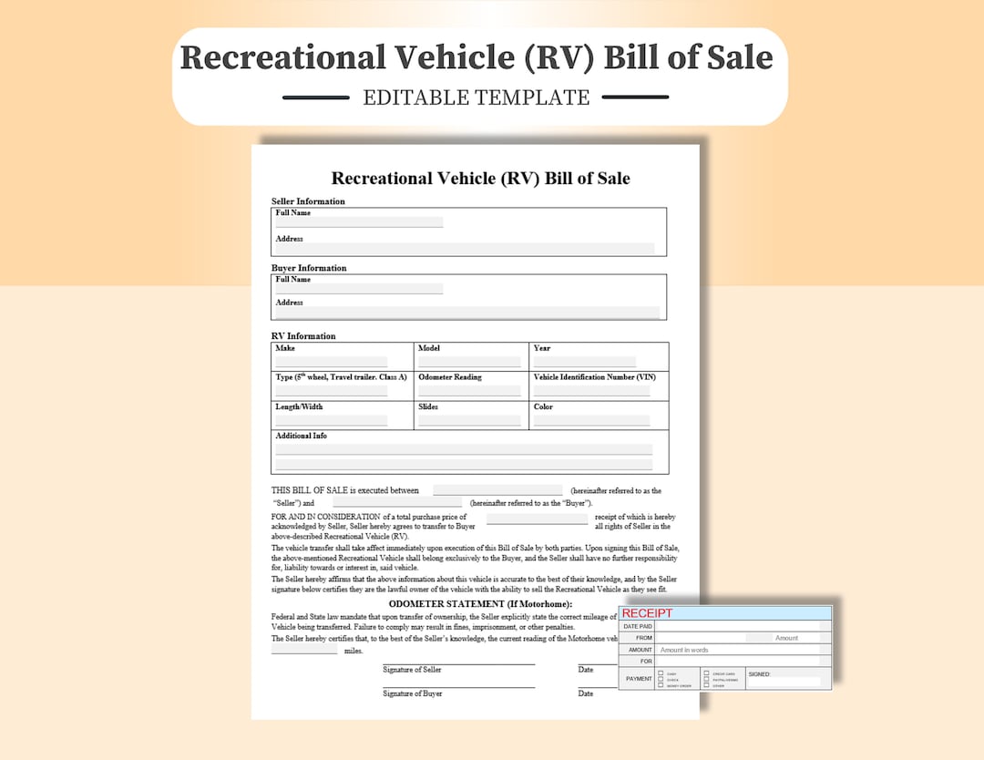 Recreational Vehicle RV Bill of Sale Contract Editable PDF Word