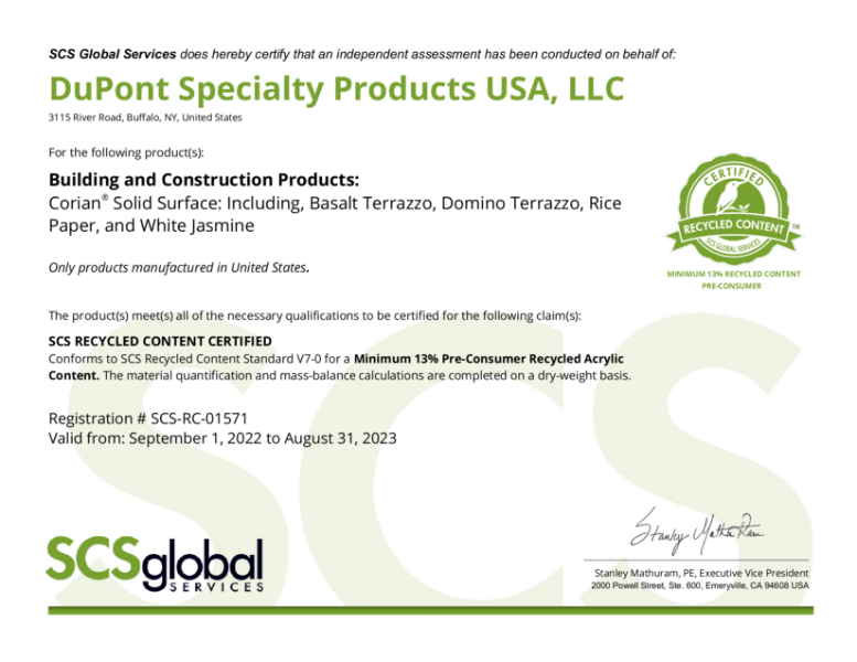 Corian® Solid Surface Recycled Content Certification (13%) CDUK NBS