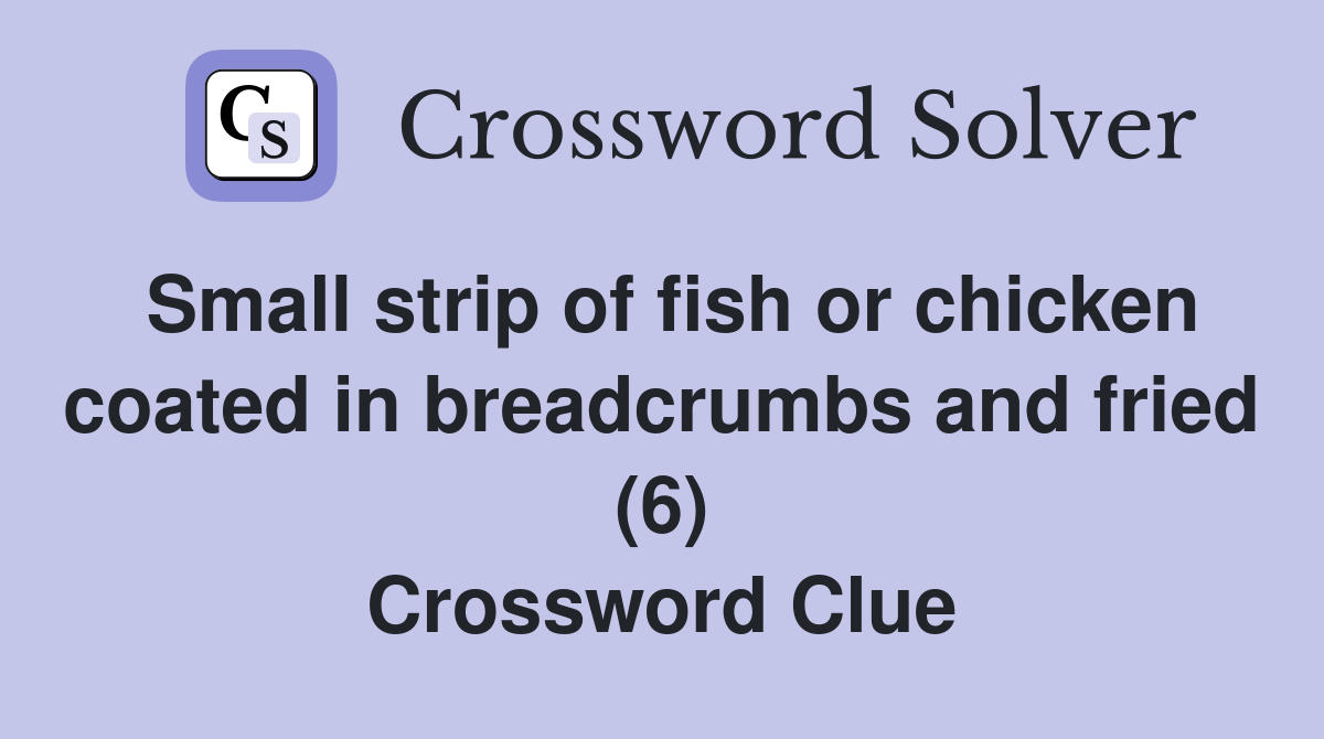 Small strip of fish or chicken coated in breadcrumbs and fried (6
