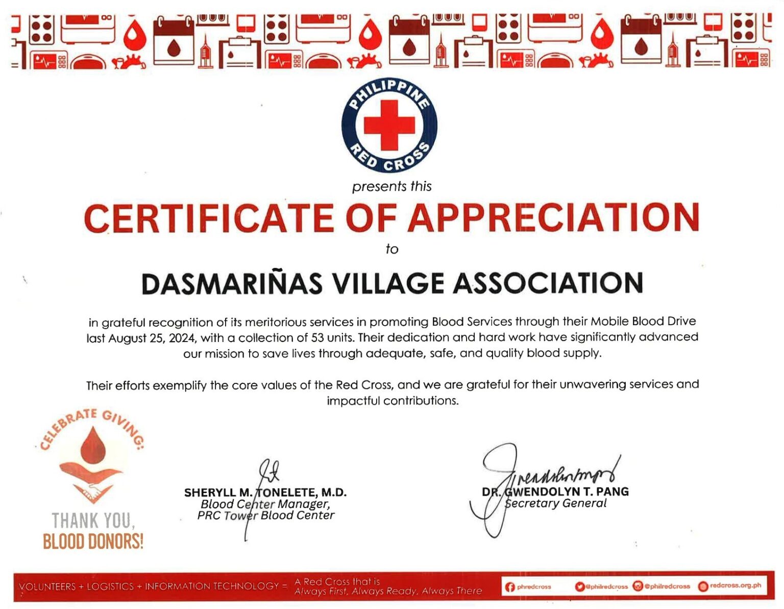 Philippine Red Cross Certificate of Appreciation for DVA s Blood Drive