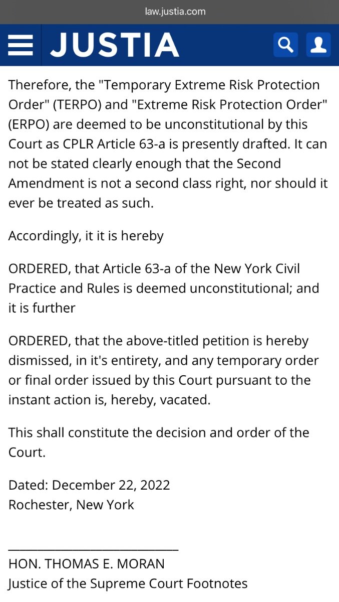 NY Red Flag Law (TERPO) ruled unconstitutional Decided by Supreme