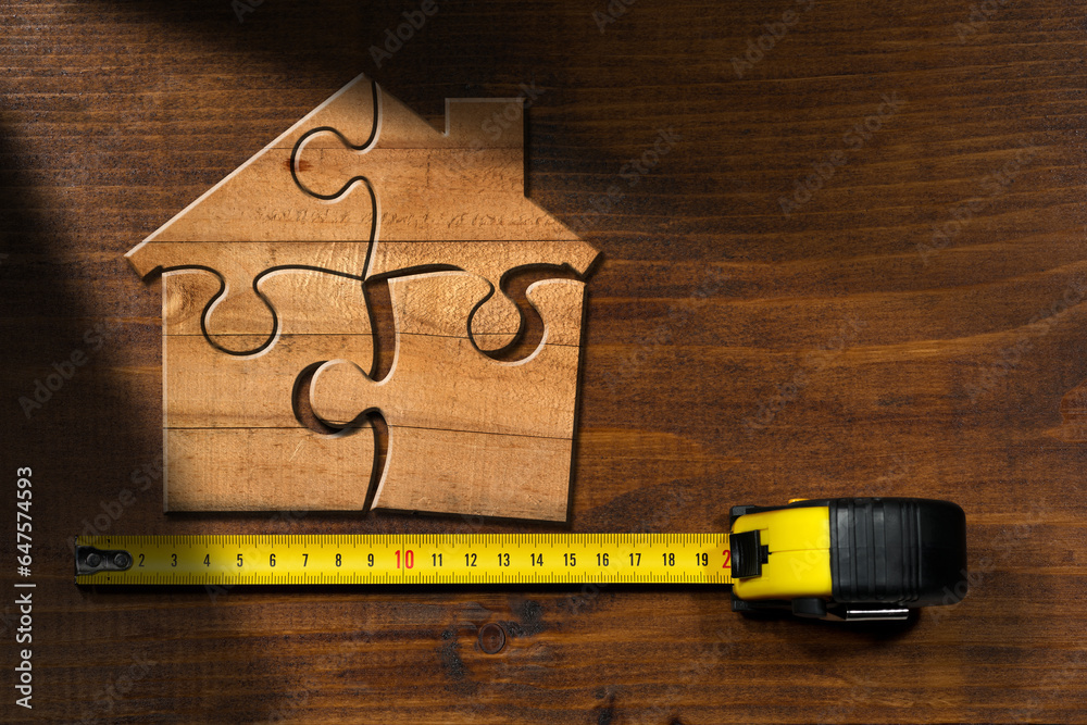 Wooden jigsaw puzzle pieces forming a house shape on a wooden