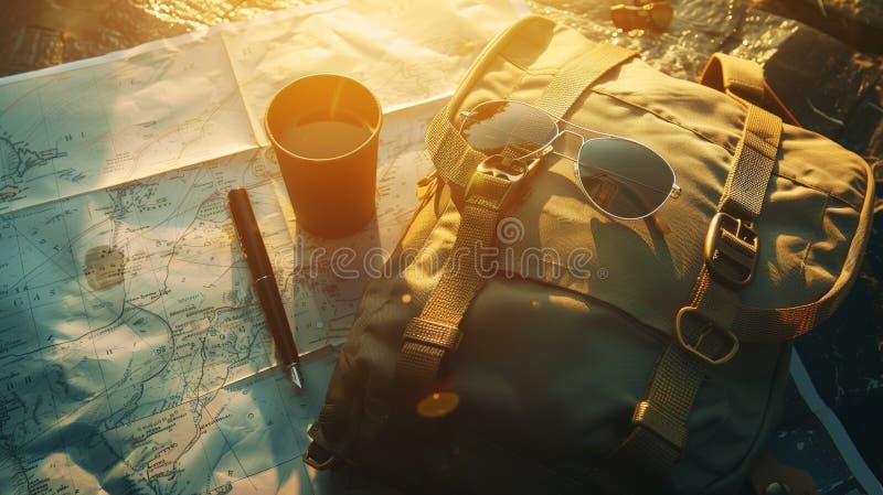 Backpack Sunglasses Map on Dark Aesthetic Background Vacation Trip