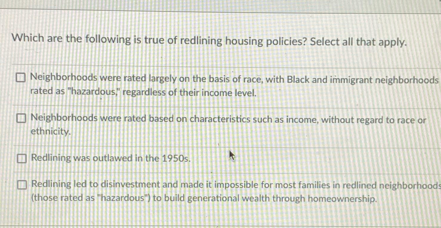 Solved Which are the following is true of redlining housing Chegg com