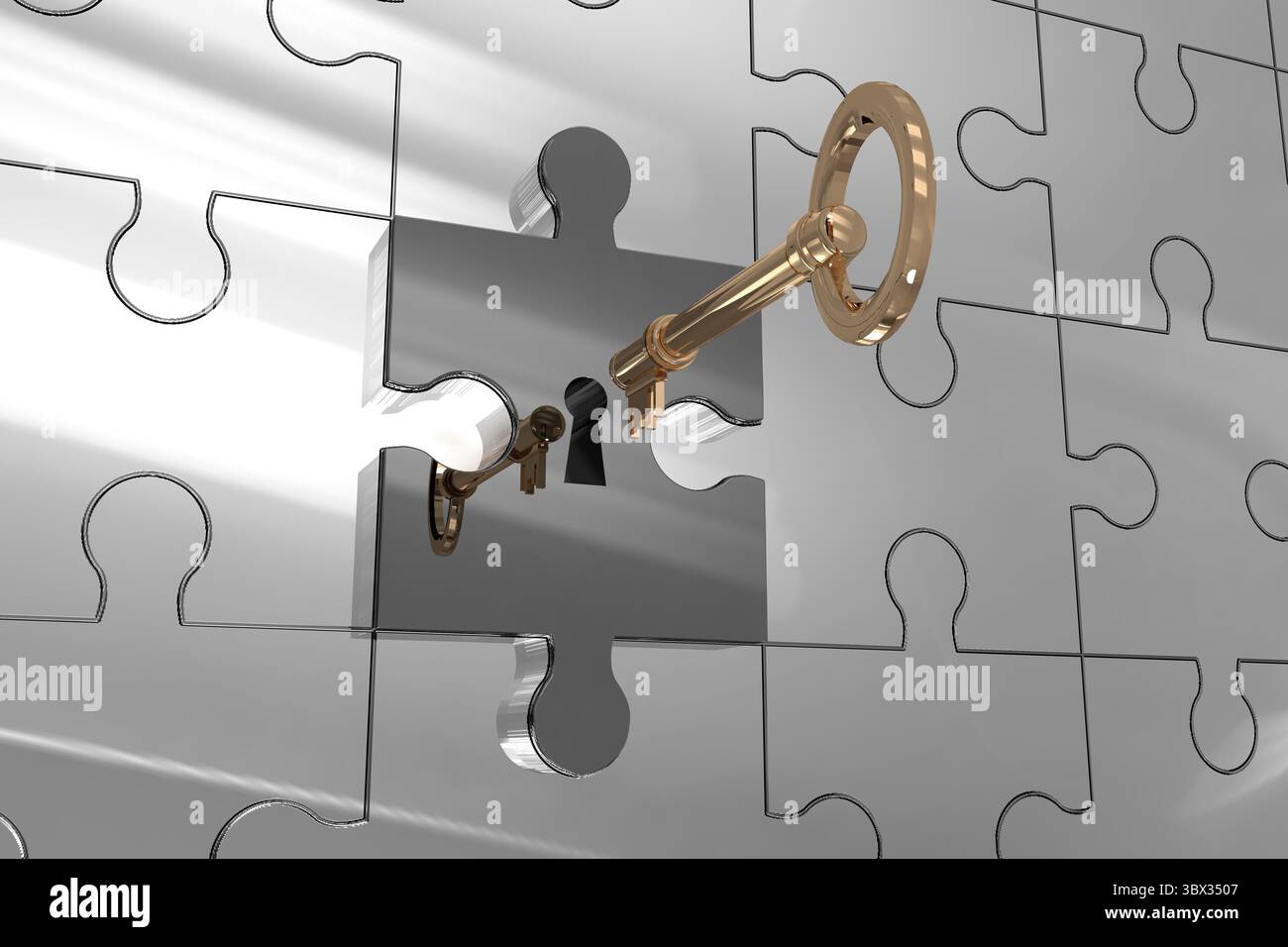 Gold key is sliding into keyhole shaped gap in reflective silver jigsaw