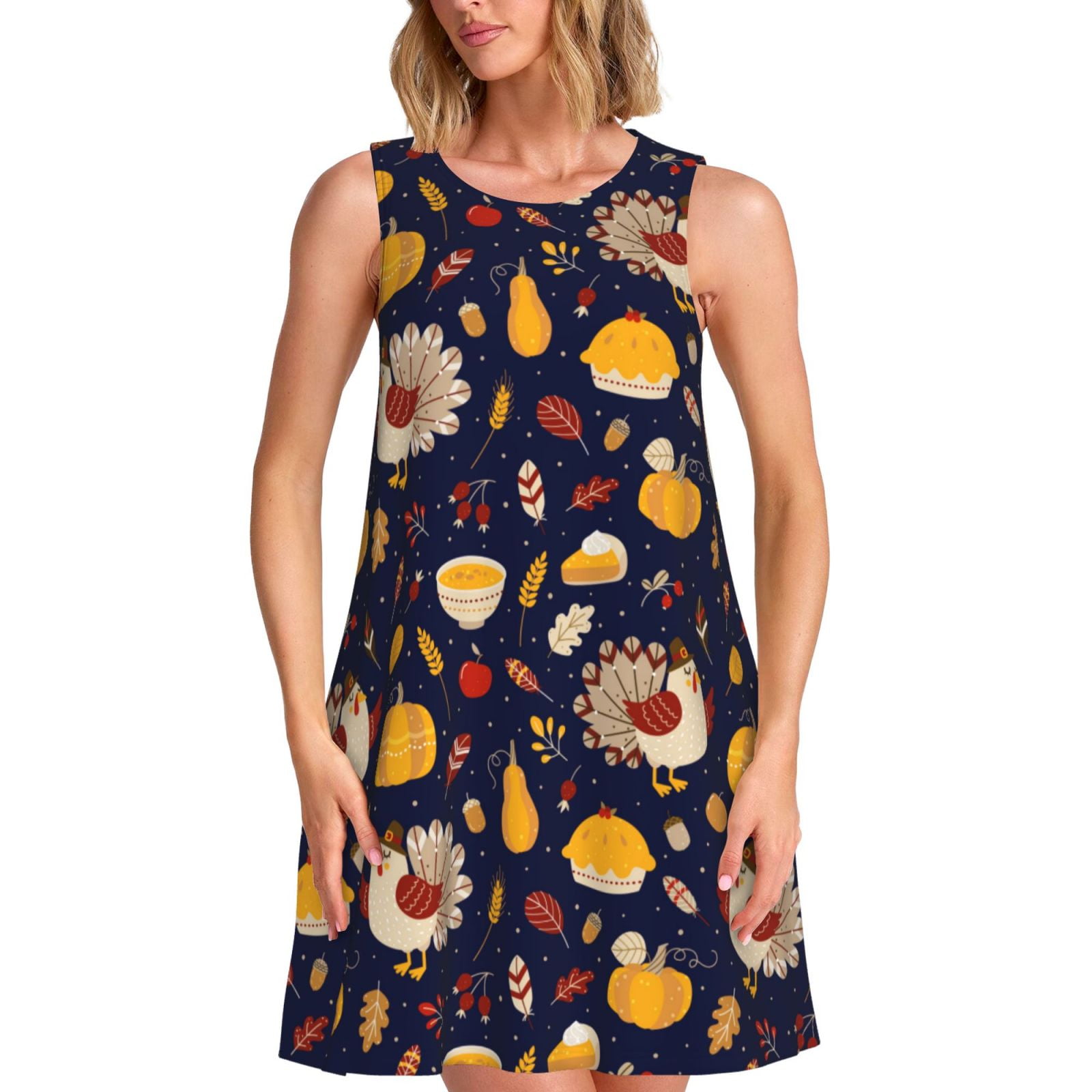 Tebeau Turkey And Autumn Print Women #39 s Sleeveless Dress Loose Fit