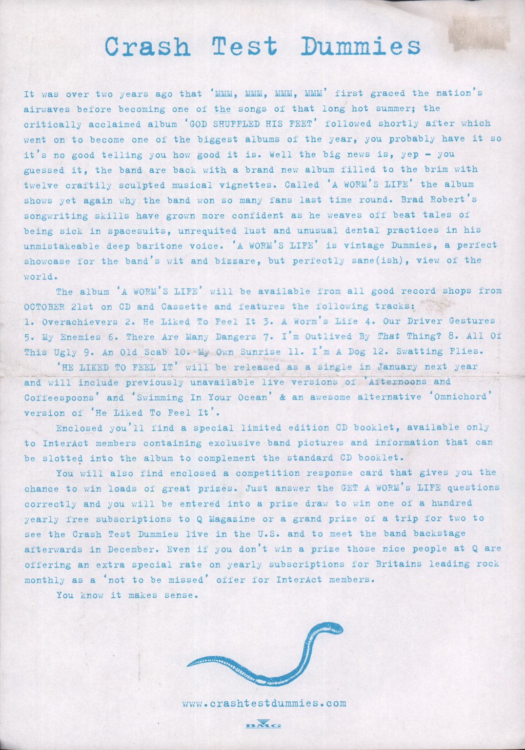 Crash Test Dummies A Worm #39 s Life Press Release Vinyl Tap