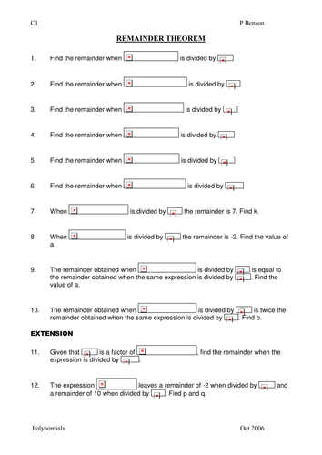 Worksheet on the Remainder Theorem by phildb Teaching Resources Tes