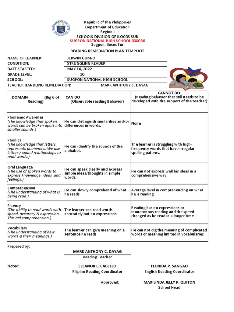 Reading Remediation Plan Template PDF Pedagogy Linguistics