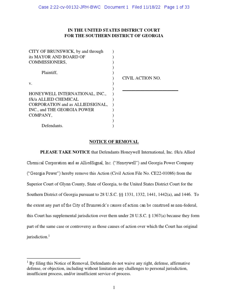 Notice of Removal of Brunswick v Honeywell To Federal Court PDF