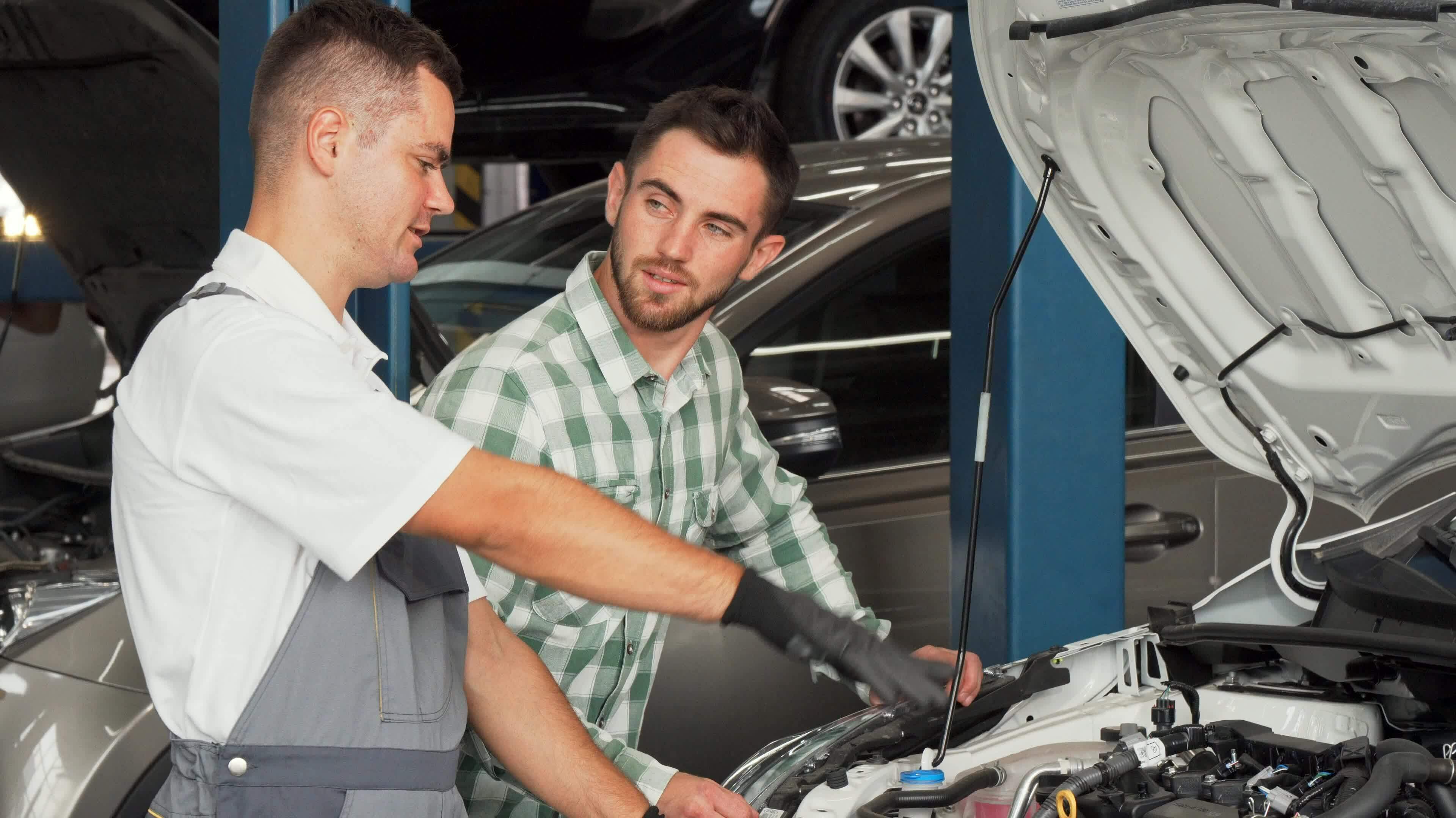 Handsome man talking to car mechanic at the repair station 33120103