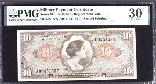 MILITARY PAYMENT CERTIFICATE $10 Series 641 RG9 Replacement PMG 30 Very