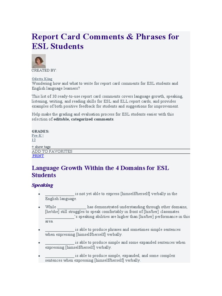 Report Card Comments PDF Adjective Cognition