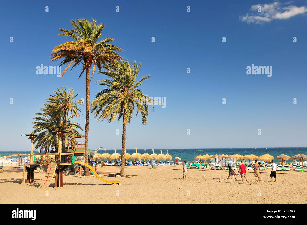 Beach With Palm Trees Marbella Costa Del Sol Andalucia Spain Stock