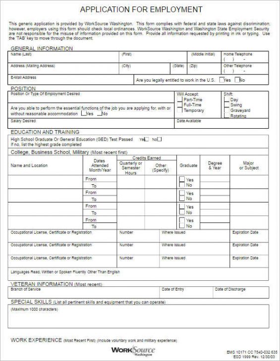 Generic Employment Application Template 8 Free PDF Documents Download