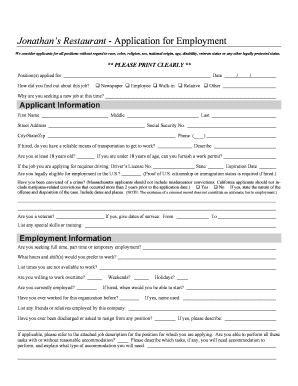 Fillable Online Jonathans Restaurant Application for Employment Fax