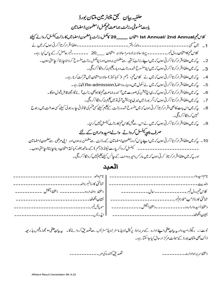 Small Affidavit Result Cancellation Part I A 2023 BISE Multan Web Portal