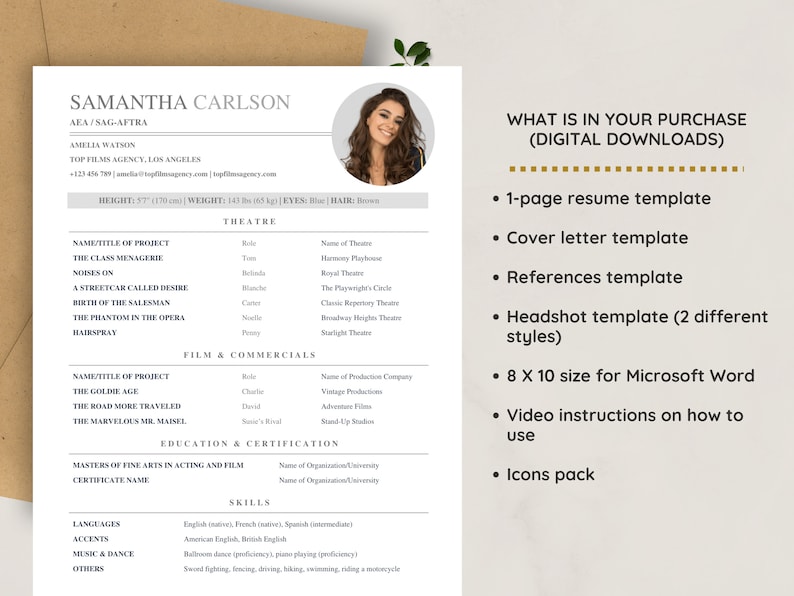 Theatre Actor Resume Template Headshot Cover Letter 8x10 for