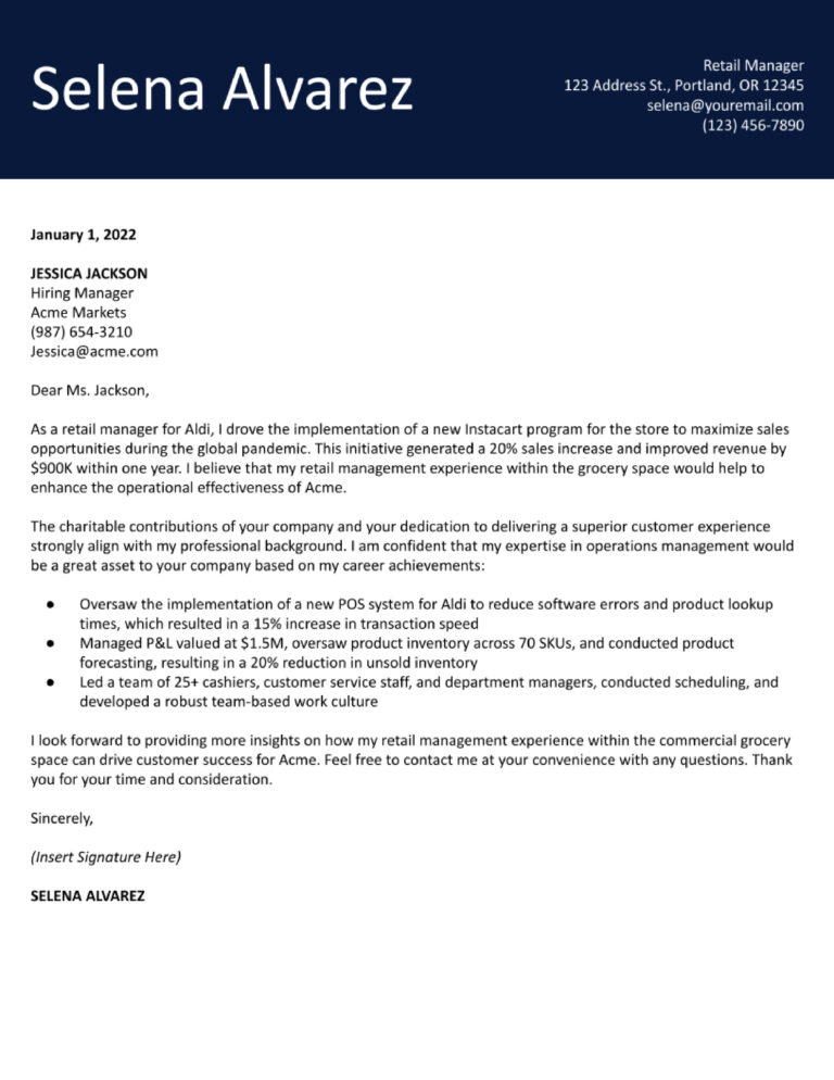 Free Retail Manager Cover Letter with Experience Template to Edit Online