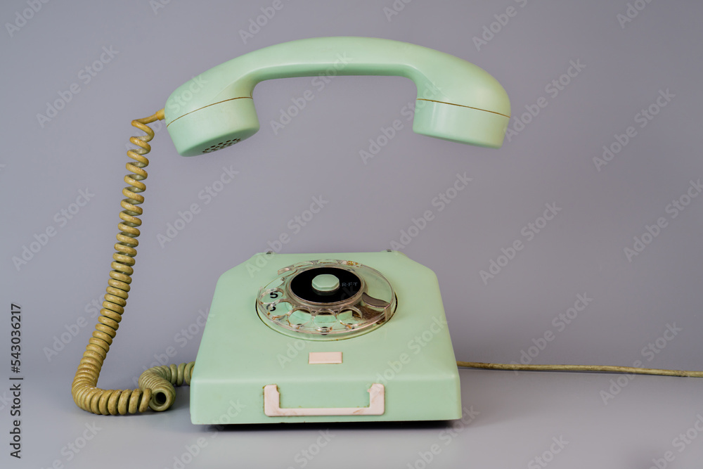 Old blue aged rotary telephone with removed hanging receiver on grey