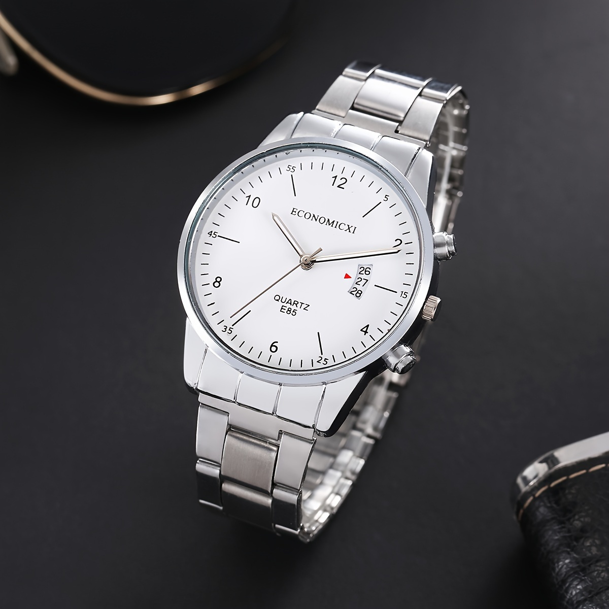 1pc Watch 1pc Simple Mens Calendar Quartz Watch Steel Band 2pcs Hip Hop
