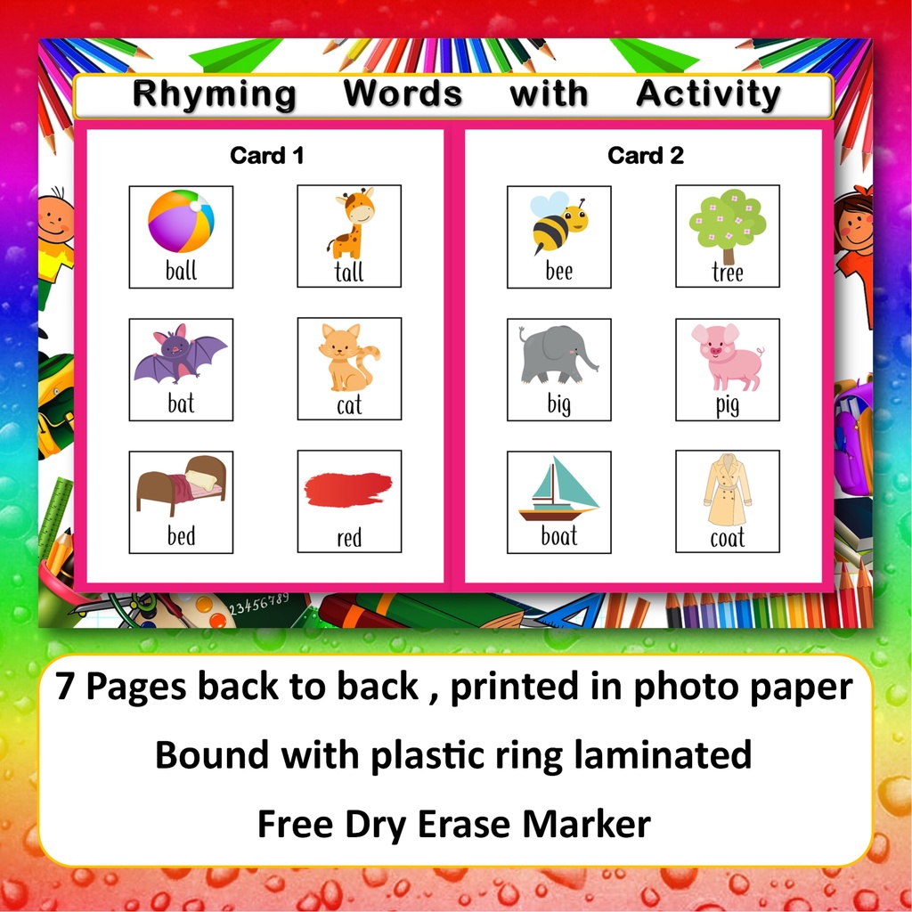 Rhyming words educational activity book for children laminated 7pages