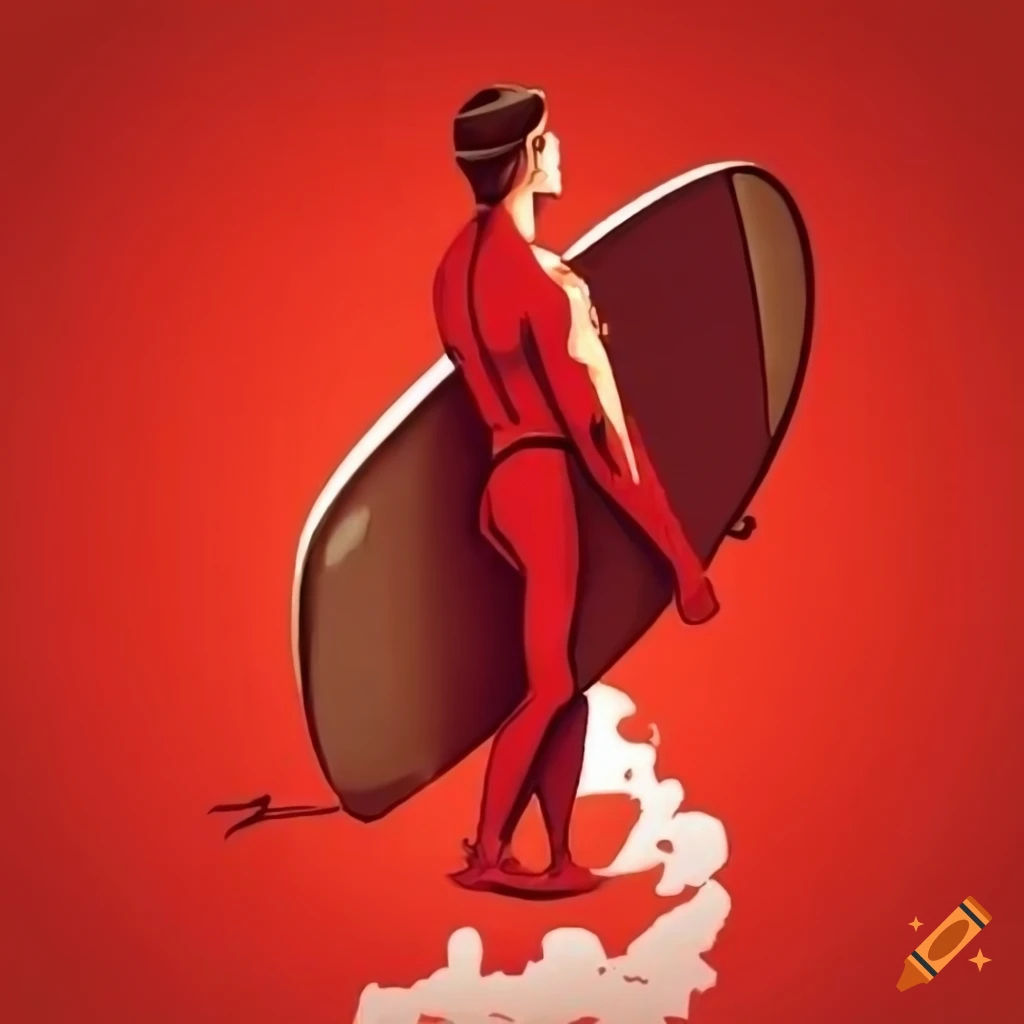 Illustration of red surfers riding waves