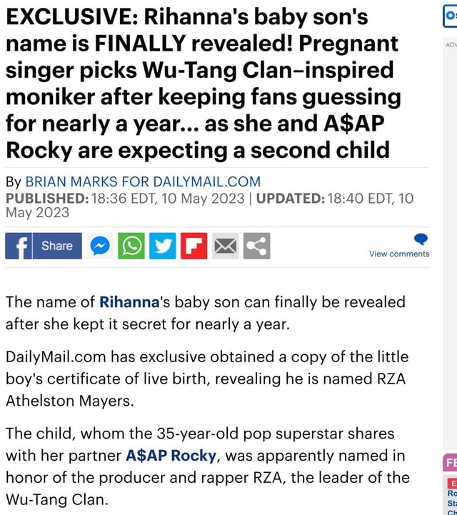 Rihanna #39 s Baby Boy Named RZA Athelston Mayers After Wu Tang Clan Member