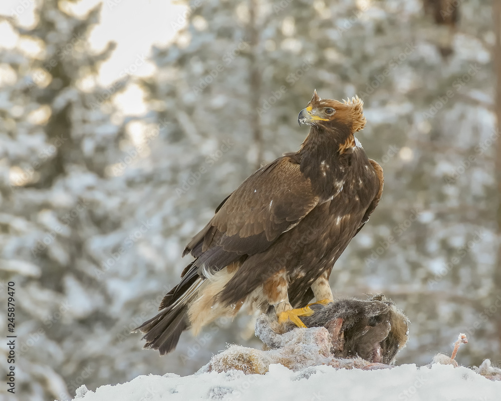 Golden eagle rips pieces of meat from frozen racoon carcass Stock Photo