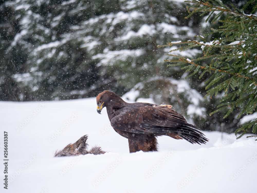 Golden eagle (Aquila chrysaetos) in the forest during snowfall rips