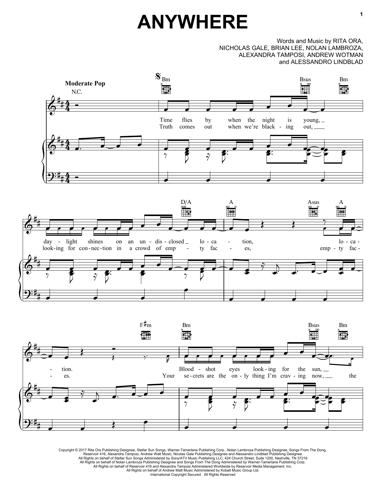 Anywhere (Rita Ora) Noten: Piano Vocal Guitar Chords Right Hand