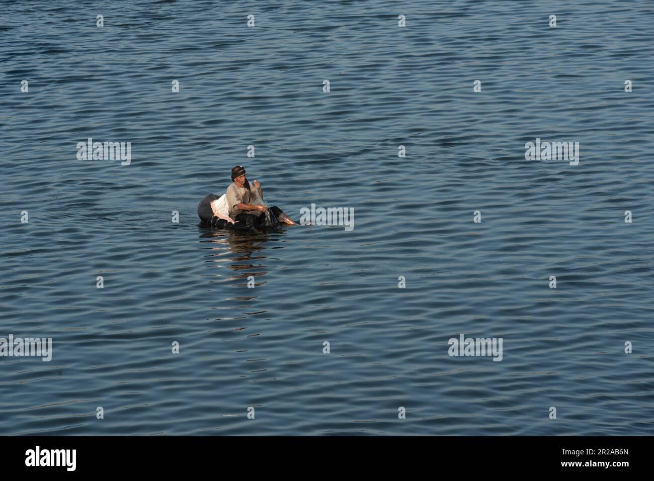 An Egyptian man fishing from a makeshift inflatable on the River Nile