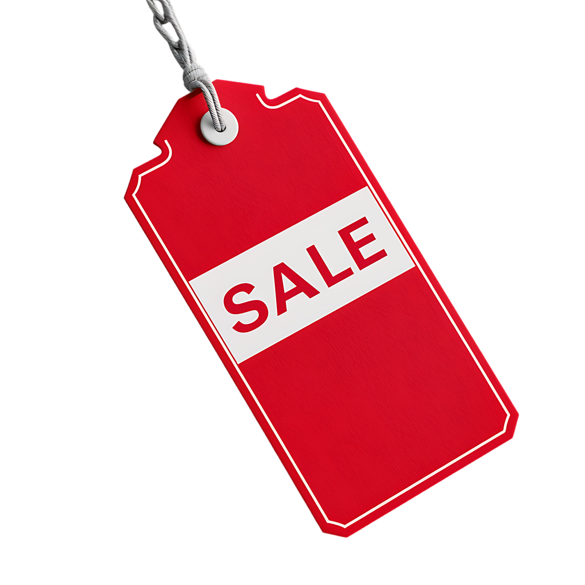 A vivid red label featuring a white counterpart boldly proclaims SALE