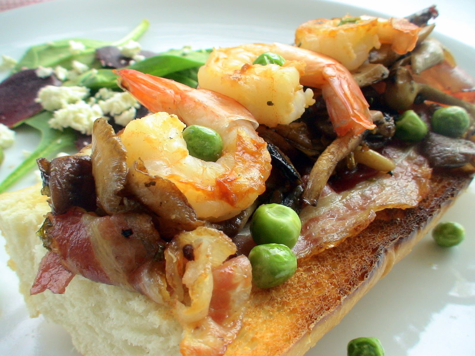 fleur de sel: mushroom toast with shrimp and peas