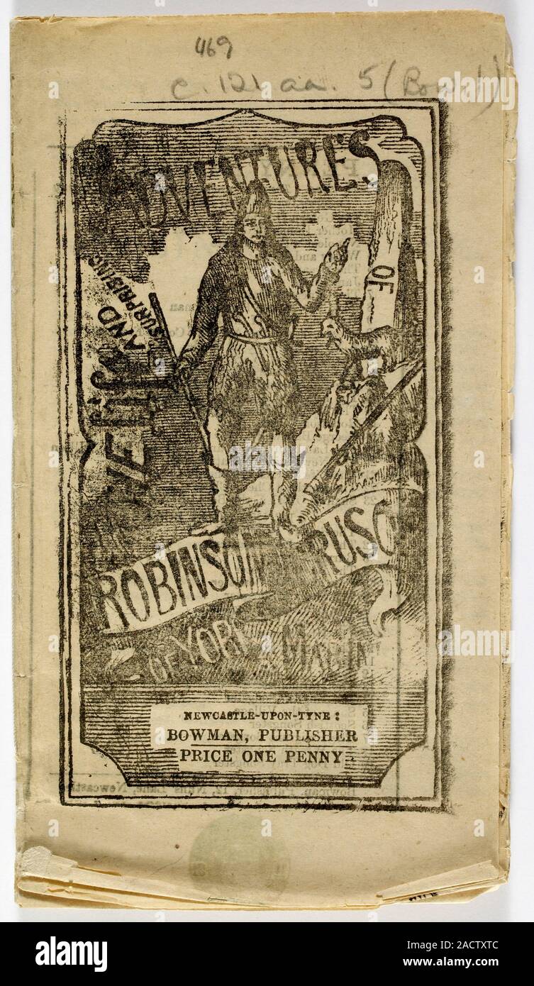 Front binding of a chap book showing an illustration of Robinson Crusoe