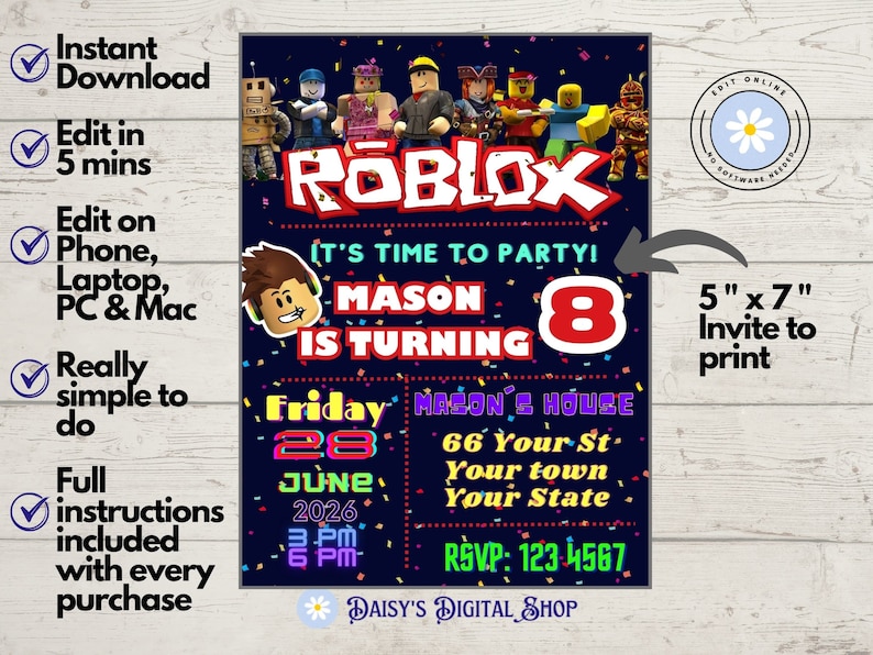 Digital Roblox Birthday Invitation Template 4 X 6 OR 5 X 7 FREE