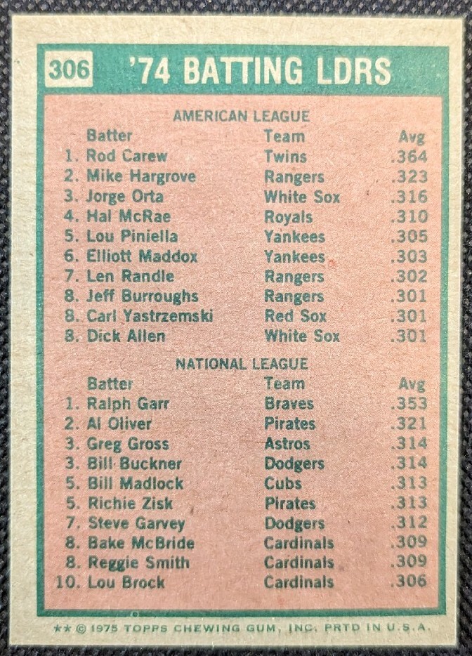 1975 Topps ROD CAREW RALPH GARR #306 Batting Leaders VG/EX Twins Braves