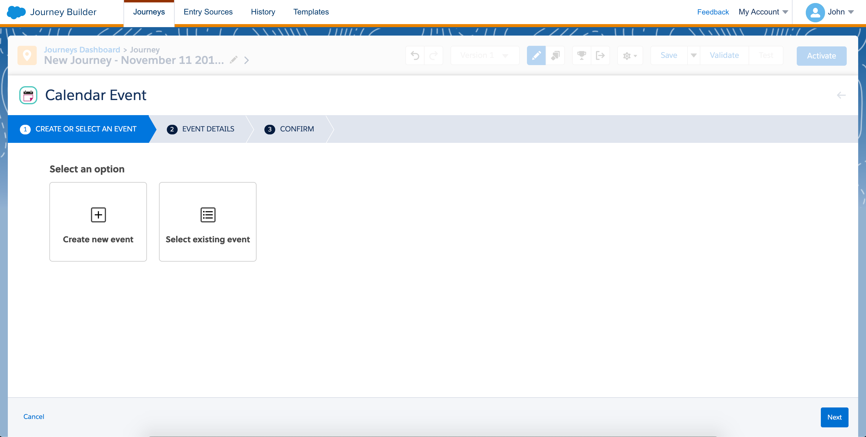 create a new event or select from a list of existing events