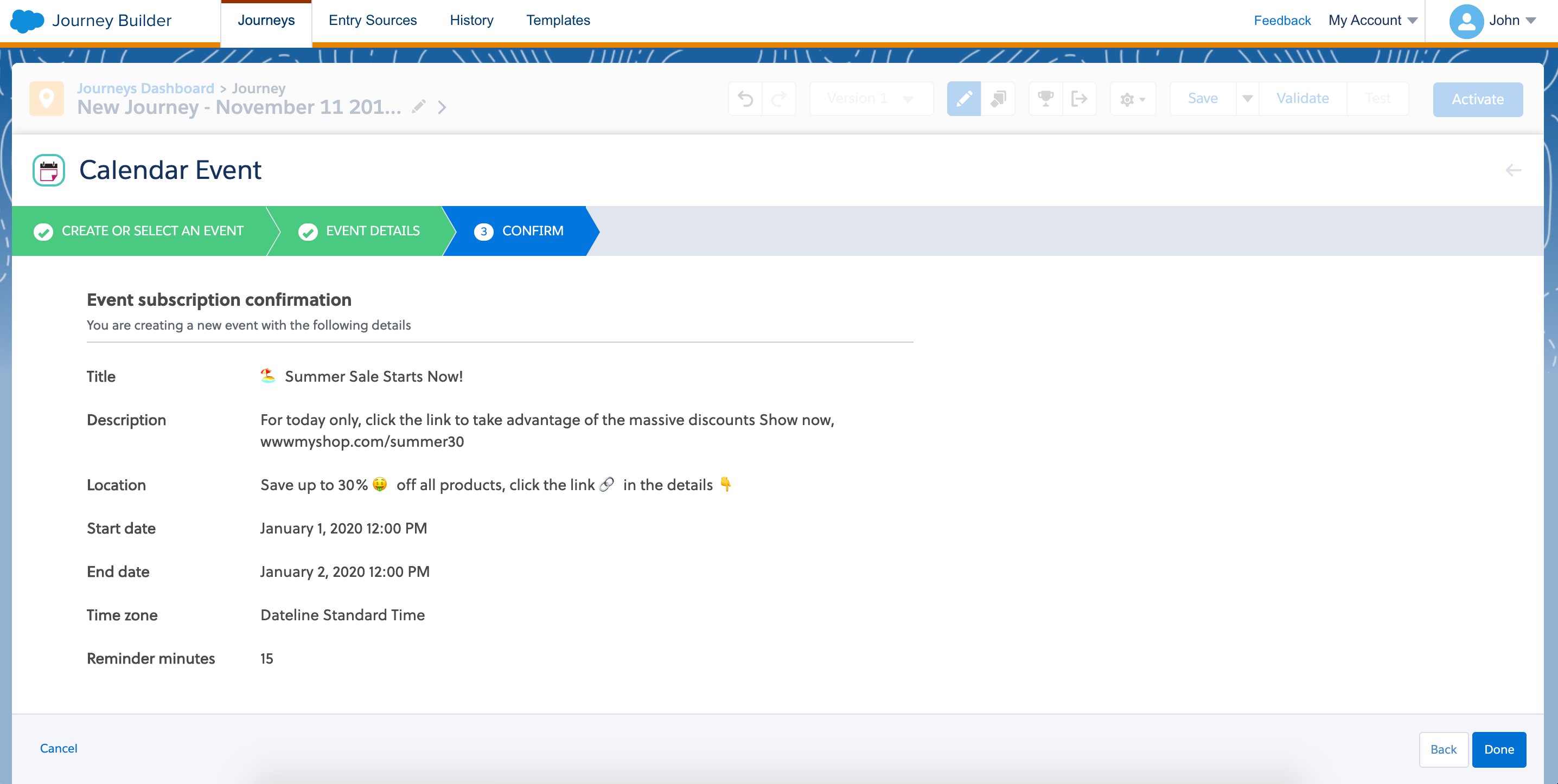 specific the details of the event to be sent out through journey builder