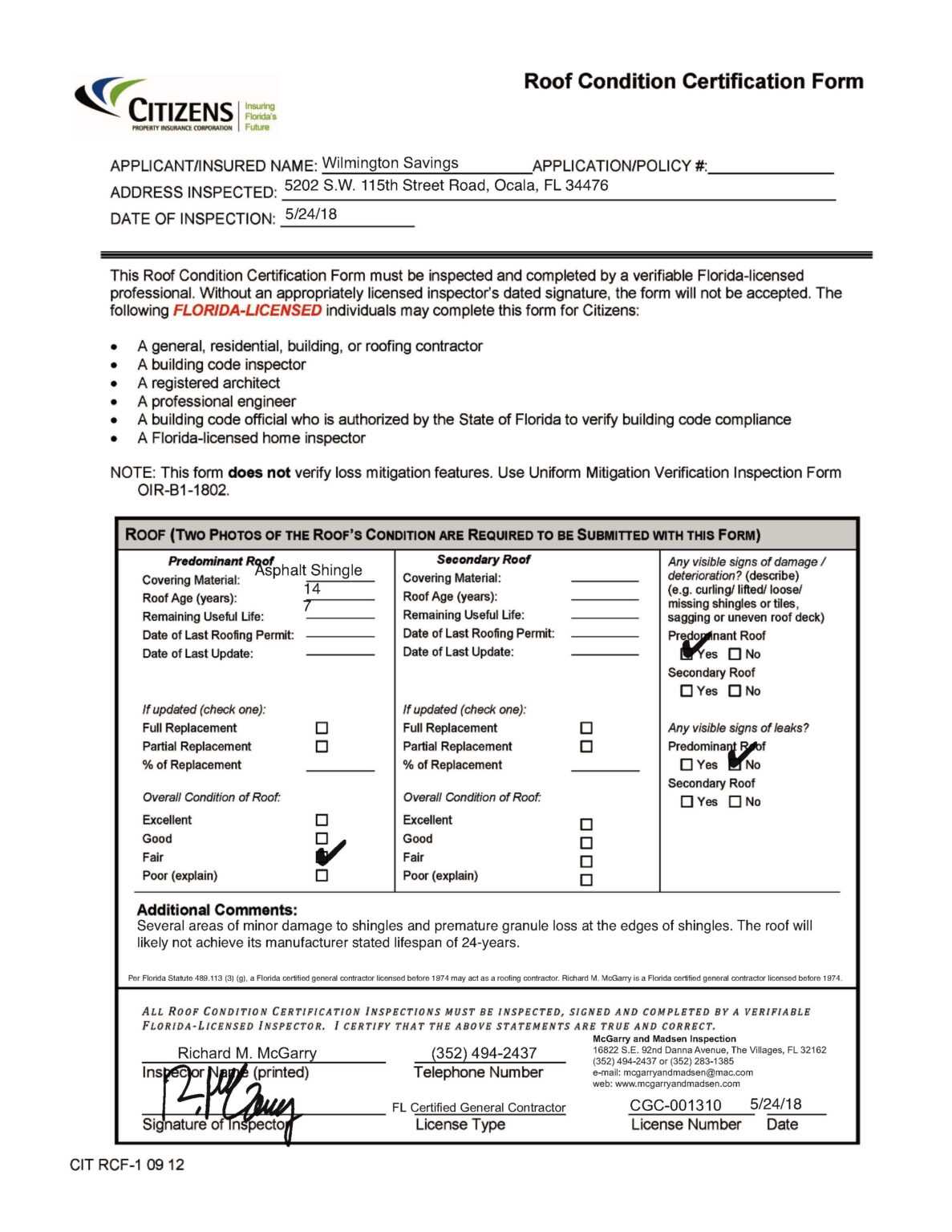 Citizens Insurance Roof Condition Certification Form Form : Resume